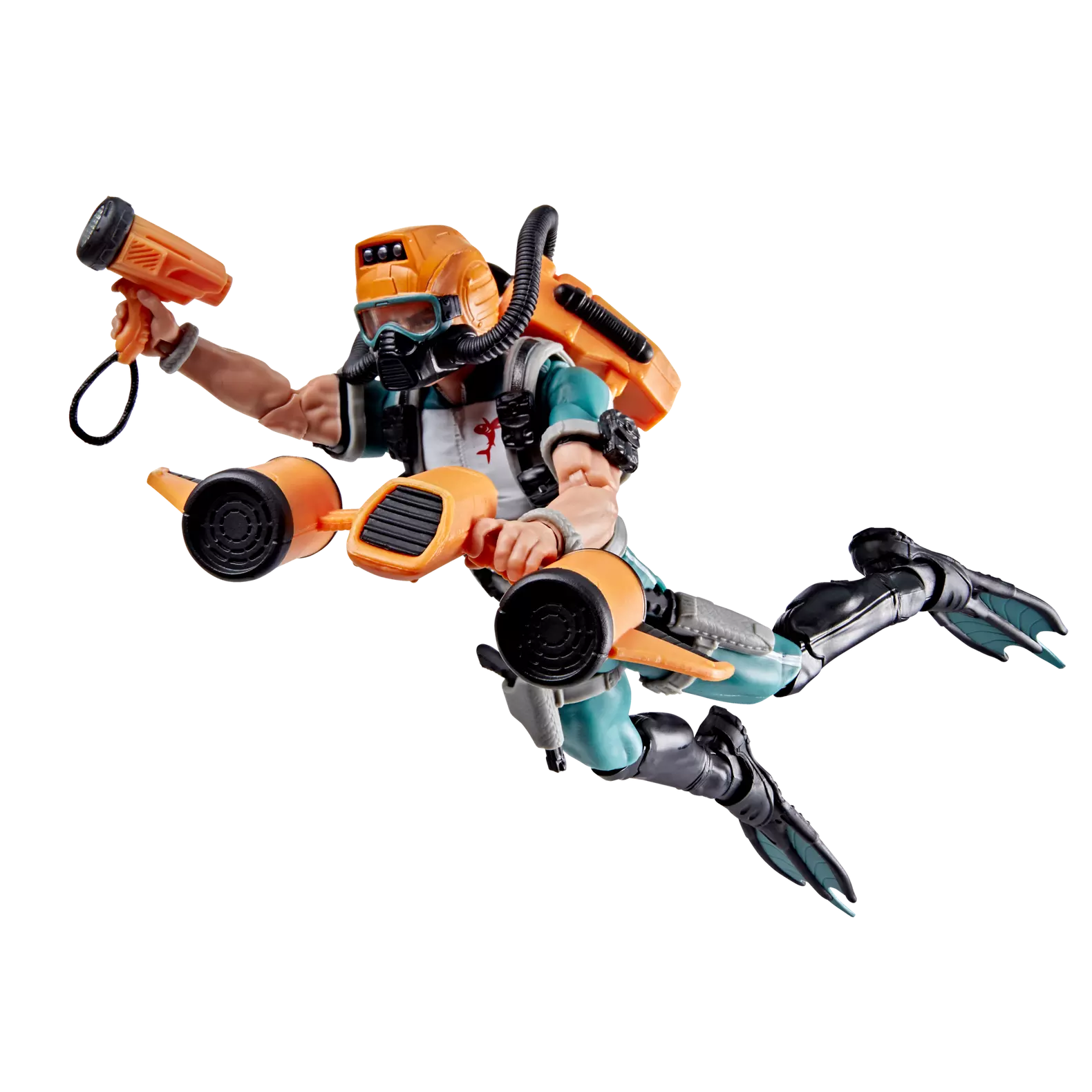 This Wet-Suit figure contains 8 character-inspired accessory pieces including removable helmet with air hoses that attach to the scuba tank backpack, searchlight, sea sled which can attach to the tank, 2 fins, knife, and weapon accessory.